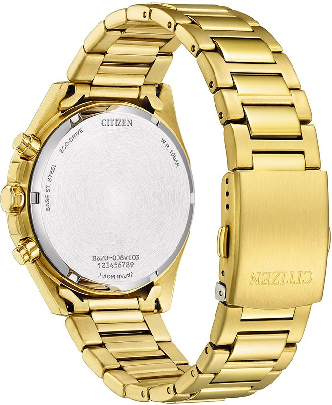 Funkce:Čas, datum, režim 12/24, chronograf = stopky, strojek quartz Japan Citizen Eco-drive Caliber B620 - kapacita akumulátoru (rezerva chodu) až 9 měsíců, přesnost chodu = 0 - 0,5 vteřiny denně, indikace potřeby dobití akumulátoru (hodinky dvouvteřinovými intervaly vteřinové ručičky indikují málo energie v akumulátoru a upozorňují tímto majitele/majitelku hodinek na potřebu vystavení hodinek světlu pro dobití), ručičky jsou opatřeny luminiscenční vrstvou (po krátkém nasvícení je v noci po dlouhou dobu dobře čitelný čas)