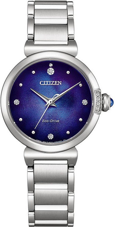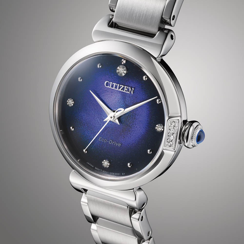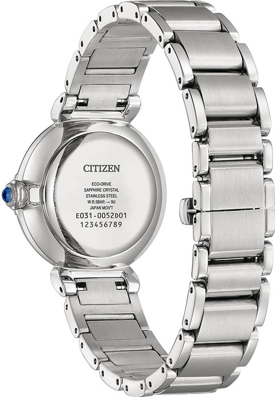 Funkce:Čas, strojek quartz Japan Eco-drive E031 - kapacita akumulátoru (rezerva chodu) až 6 měsíců, přesnost chodu = 0 - 0,5 vteřiny denně, indikace potřeby dobití akumulátoru (hodinky dvouvteřinovými intervaly vteřinové ručičky indikují málo energie v akumulátoru a upozorňují tímto majitelku hodinek na potřebu vystavení hodinek světlu pro dobití)