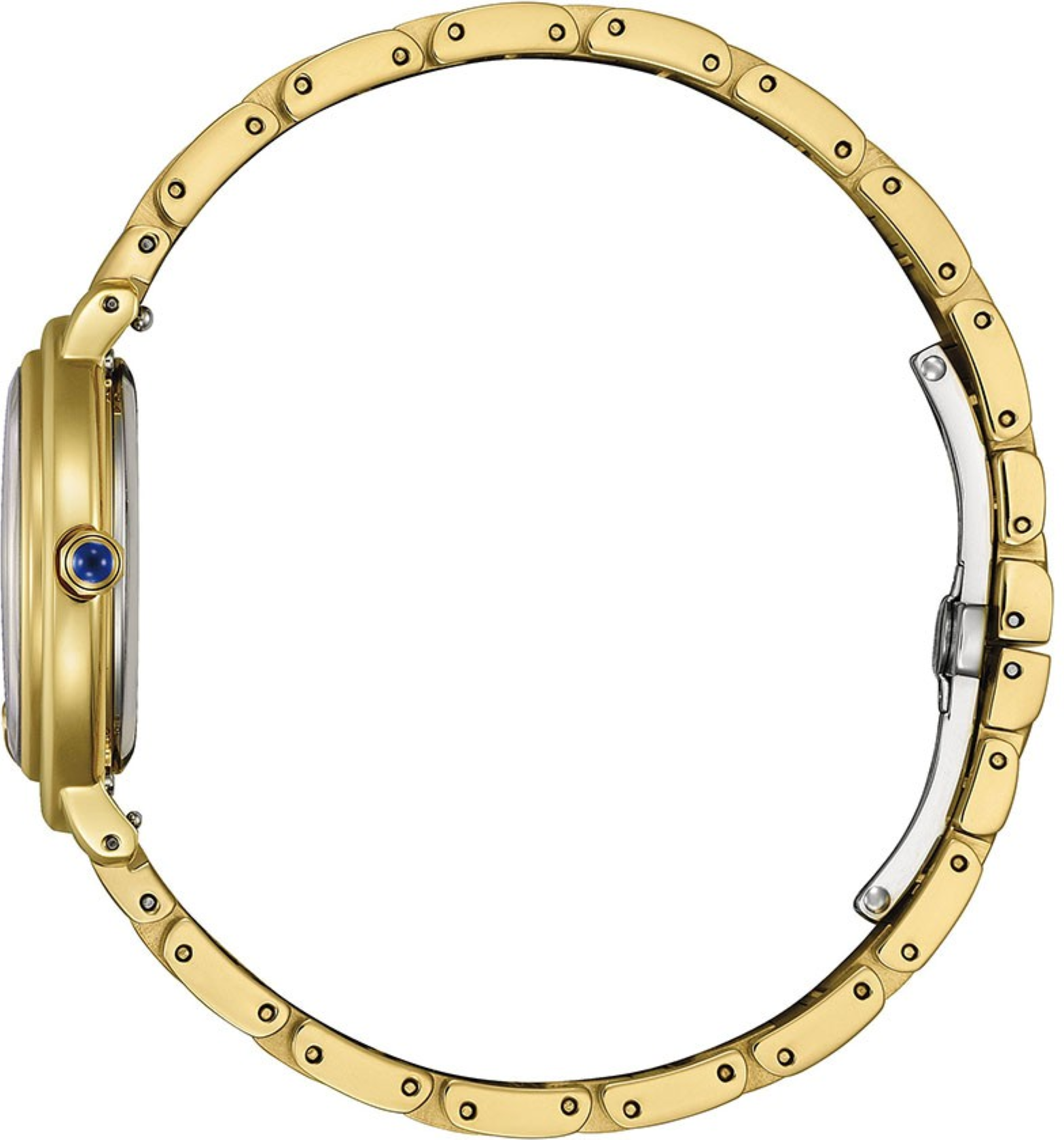 Funkce:Čas, strojek quartz Japan Eco-drive E031 - kapacita akumulátoru (rezerva chodu) až 6 měsíců, přesnost chodu = 0 - 0,5 vteřiny denně, indikace potřeby dobití akumulátoru (hodinky dvouvteřinovými intervaly vteřinové ručičky indikují málo energie v akumulátoru a upozorňují tímto majitelku hodinek na potřebu vystavení hodinek světlu pro dobití)