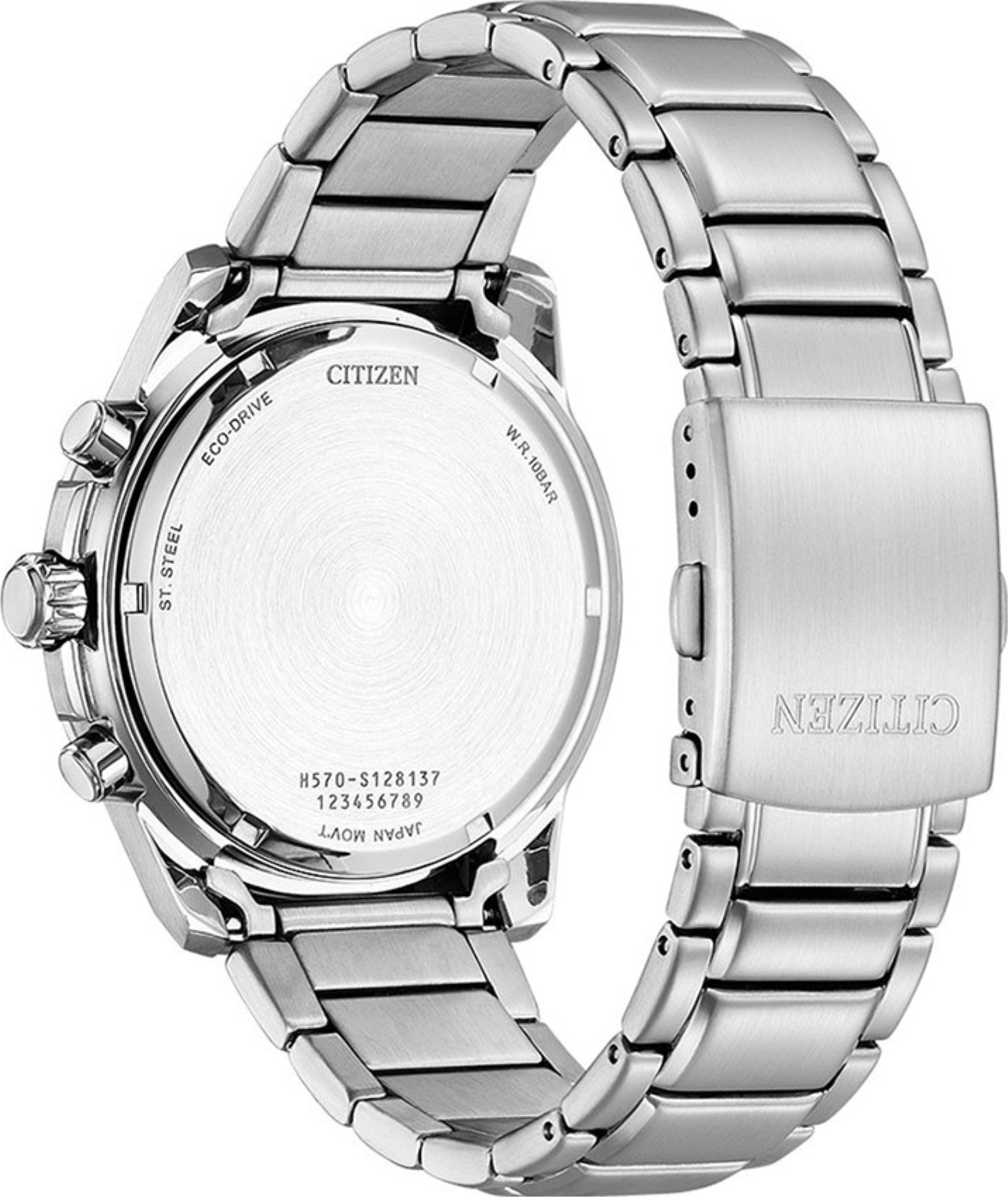 Funkce:Čas, datum, chronograf = stopky, strojek quartz Japan H570 Eco-drive - kapacita akumulátoru (rezerva chodu) až 5 měsíců, přesnost chodu = 0 - 0,5 vteřiny denně, indikace potřeby dobití akumulátoru (hodinky dvouvteřinovými intervaly vteřinové ručičky indikují málo energie v akumulátoru a upozorňují tímto majitele/majitelku hodinek na potřebu vystavení hodinek světlu pro dobití), ručičky a indexy jsou opatřeny luminiscenční vrstvou (po krátkém nasvícení je v noci po dlouhou dobu dobře čitelný čas)