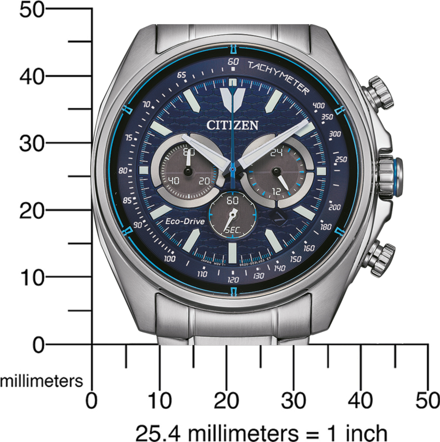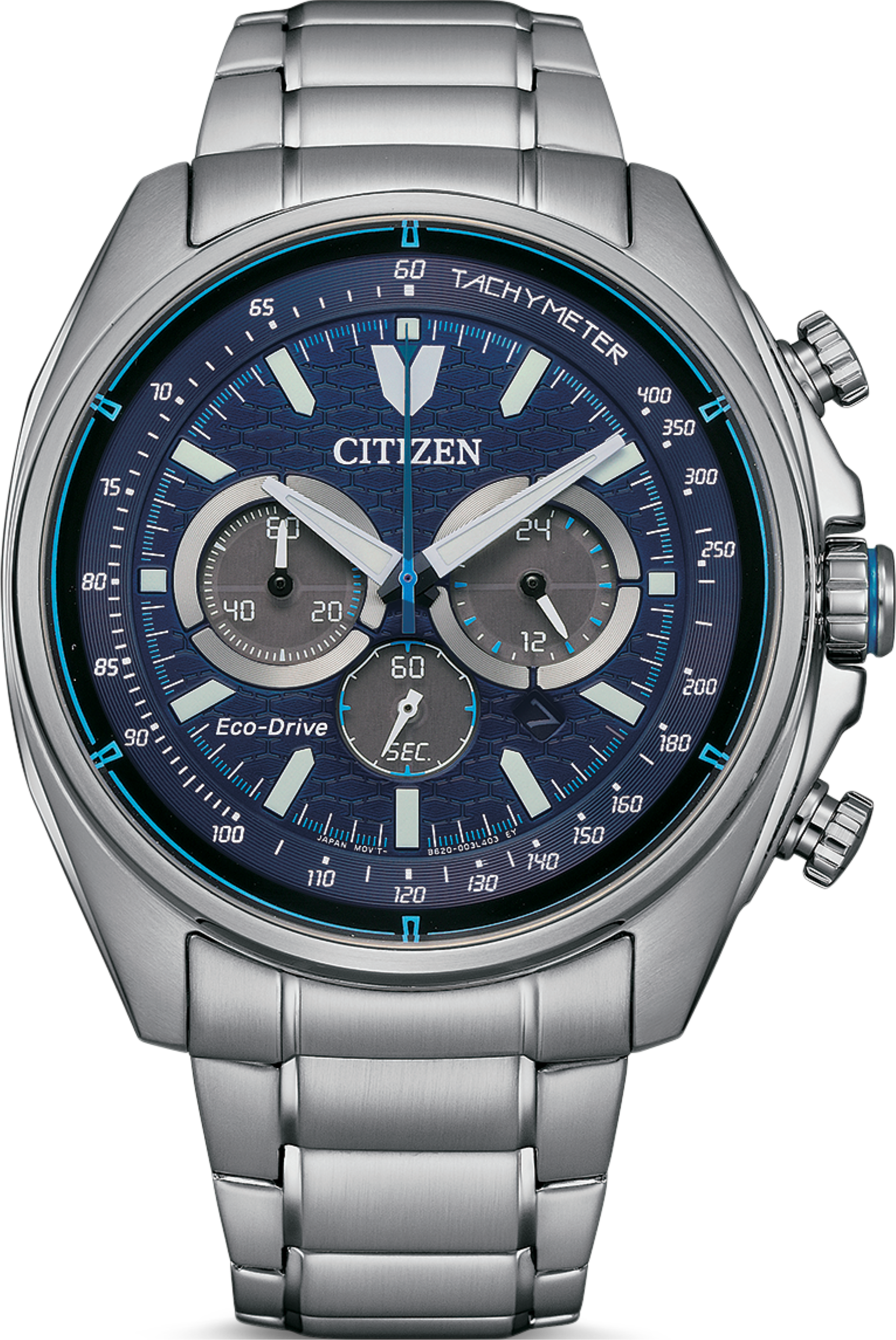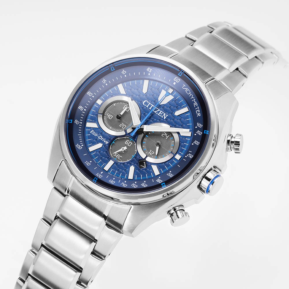 Funkce:Čas, datum, chronograf = stopky (přesnost na 1/5 vteřiny), strojek quartz Japan Citizen Eco-drive Caliber B620 - kapacita akumulátoru (rezerva chodu) až 9 měsíců (cca. 270 dní), přesnost chodu = 0 - 0,5 vteřiny denně, indikace potřeby dobití akumulátoru (hodinky dvouvteřinovými intervaly vteřinové ručičky indikují málo energie v akumulátoru a upozorňují tímto majitele/majitelku hodinek na potřebu vystavení hodinek světlu pro dobití), ručičky a indexy jsou opatřeny luminiscenční vrstvou (po krátkém nasvícení je v noci po dlouhou dobu dobře čitelný čas), 24hodinový subčíselník