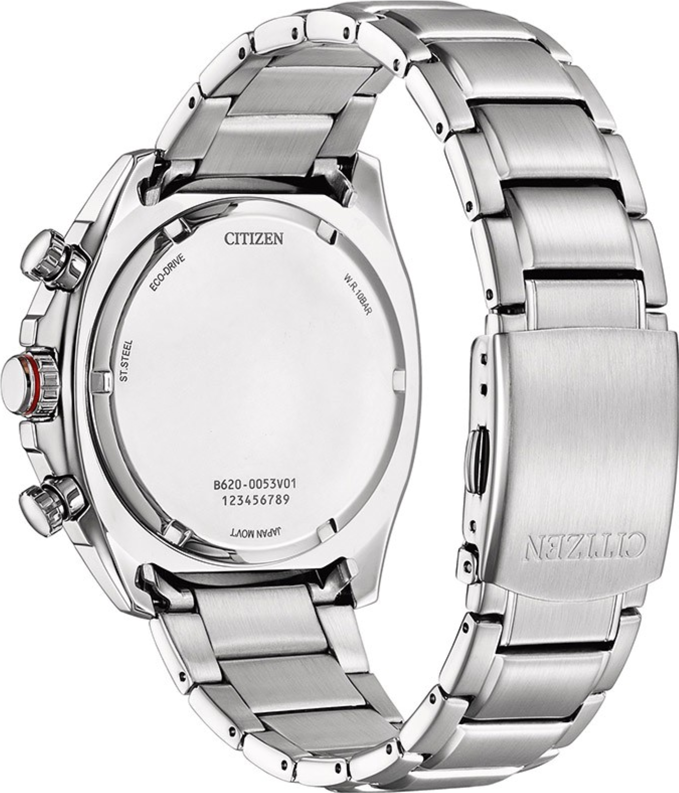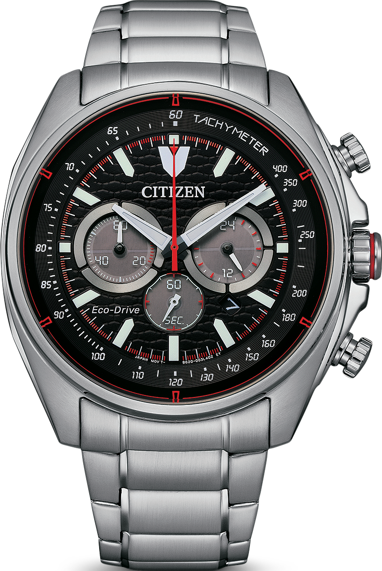 Funkce:Čas, datum, chronograf = stopky (přesnost na 1/5 vteřiny), strojek quartz Japan Citizen Eco-drive Caliber B620 - kapacita akumulátoru (rezerva chodu) až 9 měsíců (cca. 270 dní), přesnost chodu = 0 - 0,5 vteřiny denně, indikace potřeby dobití akumulátoru (hodinky dvouvteřinovými intervaly vteřinové ručičky indikují málo energie v akumulátoru a upozorňují tímto majitele/majitelku hodinek na potřebu vystavení hodinek světlu pro dobití), ručičky a indexy jsou opatřeny luminiscenční vrstvou (po krátkém nasvícení je v noci po dlouhou dobu dobře čitelný čas), 24hodinový subčíselník