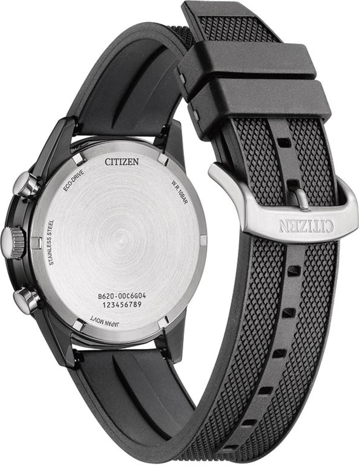 Funkce:Čas, datum, režim 12/24, chronograf = stopky, strojek quartz Japan Citizen Eco-drive Caliber B620-00M = kapacita akumulátoru (rezerva chodu) až 9 měsíců, přesnost chodu = 0 - 0,5 vteřiny denně, indikace potřeby dobití akumulátoru (hodinky dvouvteřinovými intervaly vteřinové ručičky indikují málo energie v akumulátoru a upozorňují tímto majitele/majitelku hodinek na potřebu vystavení hodinek světlu pro dobití), ručičky a indexy jsou opatřeny luminiscenční vrstvou (po krátkém nasvícení je v noci po dlouhou dobu dobře čitelný čas)