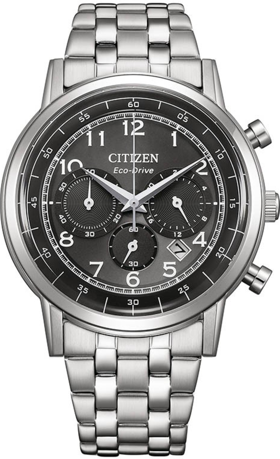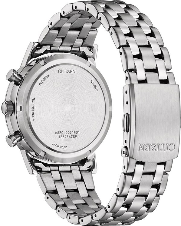 Funkce:Čas, datum, režim 12/24, chronograf = stopky, strojek quartz Japan Citizen Eco-drive Caliber B620-00M = kapacita akumulátoru (rezerva chodu) až 9 měsíců, přesnost chodu = 0 - 0,5 vteřiny denně, indikace potřeby dobití akumulátoru (hodinky dvouvteřinovými intervaly vteřinové ručičky indikují málo energie v akumulátoru a upozorňují tímto majitele/majitelku hodinek na potřebu vystavení hodinek světlu pro dobití)
