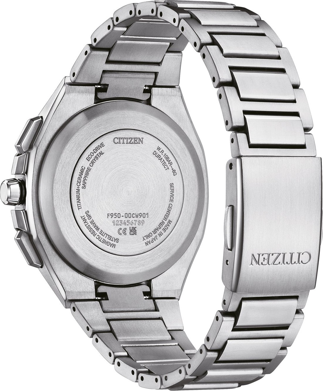 Funkce:Čas, datum, budíček, chronograf = stopky (1/20 sekundový chronograf - měří až 24 hodin), 24 hodinový ukazatel (režim 12/24), strojek Citizen Caliber F950 - řízený čas satelitem GPS (naprosto přesné hodinky), světový čas ve 27 městech (40 časových pásem), svítící ručky a indexy, systém Eco-drive - dobíjení akumulátoru umělým i přírodním světlem (energie pro pohon strojku při úplném nabití akumulátoru) = rezerva chodu: 18 měsíců, automatický věčný kalendář, ukazatel letního času, energeticky úsporný režim, výstraha potřeby dobití, indikátor nabití akumulátoru (rezervy energie), ochrana proti přílišnému nabití, světově nejvyšší rychlost příjmu signálu pro měření času ze satelitů navigace GPS – již za 3 sekundy
