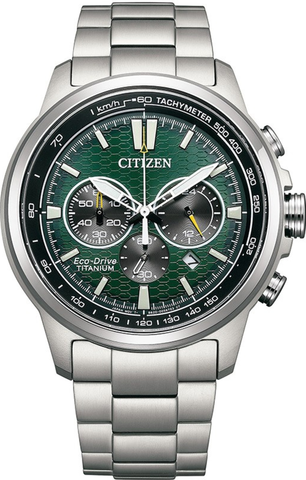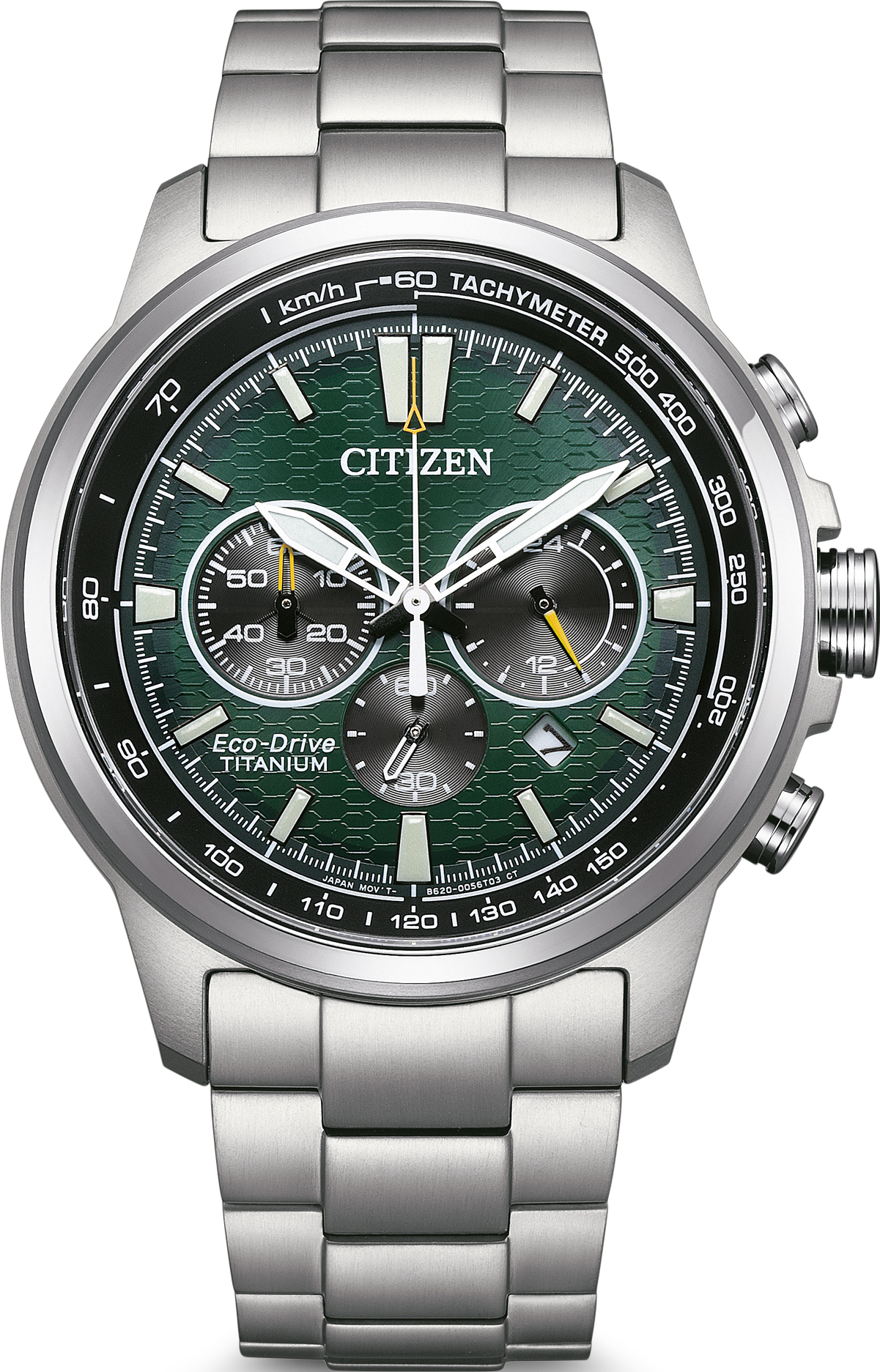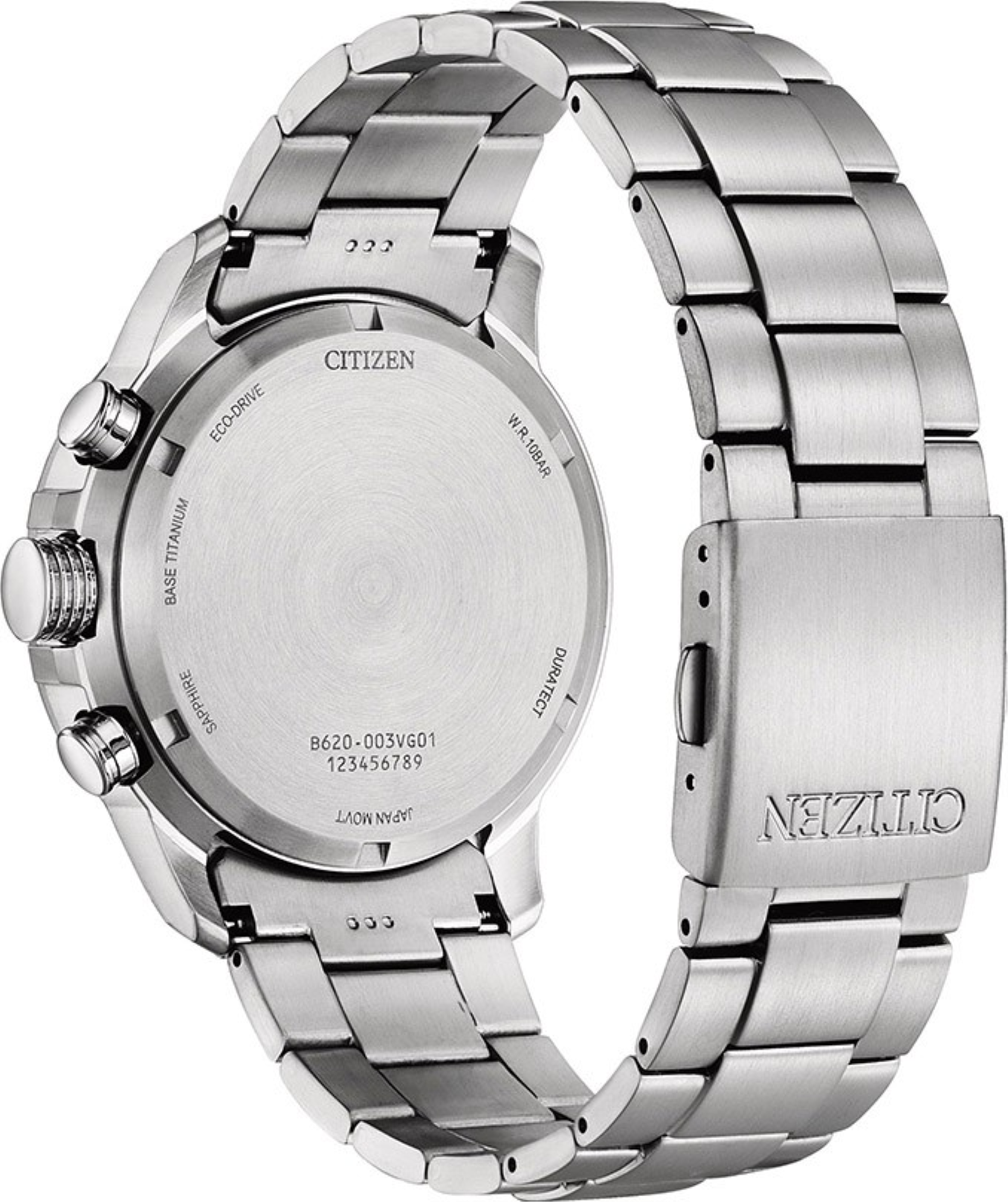 Funkce:Čas, datum, tachymetrická stupnice, chronograf = stopky (přesnost na 1/5 vteřiny), strojek quartz Japan Citizen Eco-drive Caliber B620 - kapacita akumulátoru (rezerva chodu) až 9 měsíců, přesnost chodu = 0 - 0,5 vteřiny denně, indikace potřeby dobití akumulátoru (hodinky dvouvteřinovými intervaly vteřinové ručičky indikují málo energie v akumulátoru a upozorňují tímto majitele/majitelku hodinek na potřebu vystavení hodinek světlu pro dobití), ručičky a indexy jsou opatřeny luminiscenční vrstvou (po krátkém nasvícení je v noci po dlouhou dobu dobře čitelný čas), 24hodinový subčíselník